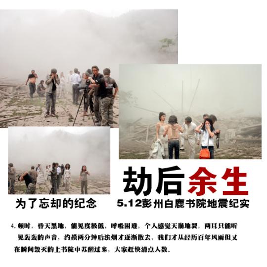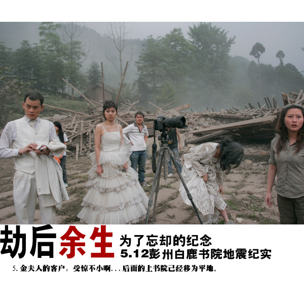 14:38分左右,我們?yōu)榭蛻魮Q裝造型,我突然聽到好像下雨的聲音,轉(zhuǎn)眼一看,瓦片從房頂?shù)粝聛,接著就是天旋地動,突然一個MM喊了聲,地震了!說是遲,那是快,所有的人都跑到書院的中心位置,就地趴下......