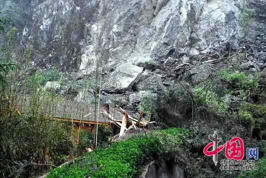 2008-05-12 15:46 地震后的后山,滾下的山石砸毀了基地的房屋。