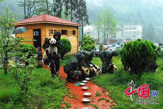 中國(臥龍)保護(hù)大熊貓研究中心位于5.12大地震的中心地帶,震后30小時(shí)內(nèi)與外界完全失去通訊聯(lián)系。在這成為孤島的30個(gè)小時(shí)里,工作人員們堅(jiān)守崗位,及時(shí)將大熊貓轉(zhuǎn)移到安全地點(diǎn)。大熊貓?jiān)诘卣鹬惺艿襟@嚇,有的縮作一團(tuán),有的不愿意進(jìn)食,工作人員們象對待孩子一樣安撫他們,在運(yùn)送物品困難的情況下象往常一樣為國寶們準(zhǔn)備食物。為了搶救熊貓,有的工作人員被砸傷。地震中滯留這里的外國游客和研究人員都得到了妥善的保護(hù),均沒有受傷。