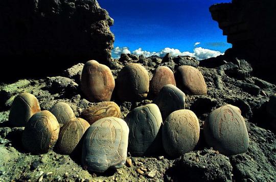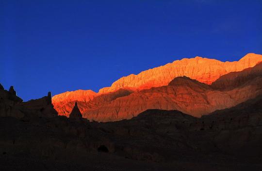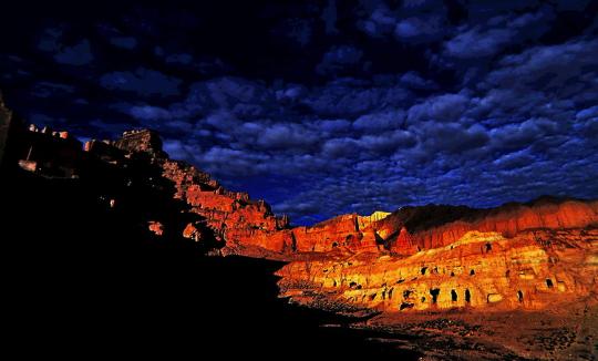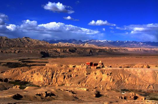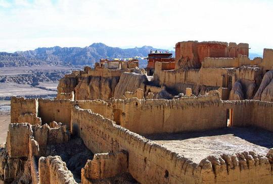 古格王國(guó)遺址雄偉壯麗、氣勢(shì)磅礴,有著不可復(fù)制的絕美。古老城堡的斷壁殘?jiān)c山腳下的土林渾然一體,使人難以分辨究竟何為城堡、何為土林。殘缺的美給古格帶來(lái)神秘感,千年的象雄文明給古格留下無(wú)數(shù)寶藏,其中石刻佛像、神殿壁畫最引人注目。從1994年至2005年我多次進(jìn)入古格,發(fā)現(xiàn)這里的石刻佛像越來(lái)越少、幾乎絕跡,讓人十分心痛。古格王國(guó)遺址位于阿里象泉河南岸,距扎達(dá)縣城19公里。在一座高300多米的黃土山上,有古格王朝的宮殿、廟宇、城堡。這座傳奇的城堡居高臨下,地勢(shì)險(xiǎn)峻,氣勢(shì)雄偉壯觀,內(nèi)有四通八達(dá)的地道,外有堅(jiān)實(shí)的城墻,猶如銅墻鐵壁,固若金湯。登上古格城堡,俯視扎達(dá)土林旁的古格夏宮遺址,你會(huì)驚嘆這里的曾經(jīng)有過(guò)的輝煌歷史,并在傳奇的故事中穿越時(shí)空隧道,回到從前的象雄古國(guó)夢(mèng)境。古格王朝興盛繁榮了700余年,傳承20余代國(guó)王,距今有1300年的歷史,于十七世紀(jì)忽然滅亡,古格城堡廢墟,空守千年傳奇歲月,遺世獨(dú)美,神秘而肅穆。古格文明的忽然消失與南美瑪雅文明及意大利的龐貝古城的遭遇有著驚人的相似之處,留下許多歷史之迷有待來(lái)者揭開。