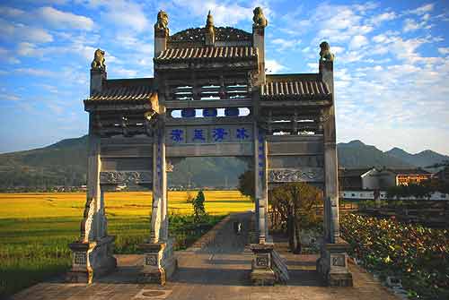 村前的雙虹橋和橋端的牌坊也很美,橋下小河潺潺,岸邊楊柳依依。隔著堤還有一方荷花池,池中有曲橋和亭臺。