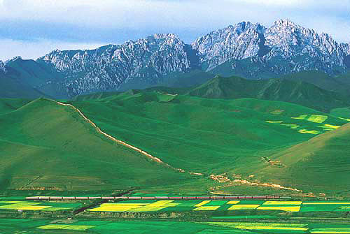 在擁擠不堪的列車?yán)锒冗^了難熬的四個小時,我轉(zhuǎn)道往寧夏旅行。從武威到中衛(wèi)的那段鐵路,也許是最接近沙漠的鐵路了。進入騰格里大漠,鐵軌就架在沙地之上,列車?yán)@著沙丘蜿蜒行進,有時站在中間車廂的我可以看見列車象蛇一樣扭曲成了個半圓形。