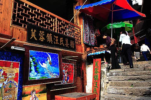 定了定神,按路牌指示的方向向鎮(zhèn)內(nèi)走去,漸漸地有了熱鬧的人聲,慌亂的心神才安定了下來(lái)。首先吸引我的是鎮(zhèn)口的那一條湍急的河,此時(shí)正在枯水期,水流不大,河床底那被水流沖出的大小窟窿象極了冰臼,吸引得我連連拍了好幾張相片。鎮(zhèn)口還是那么臟、亂,大大小小的中巴、小巴在攬客,通過(guò)一個(gè)滿地泥濘的市場(chǎng),才找到通往鎮(zhèn)內(nèi)的那條石板路。鎮(zhèn)內(nèi)很寧?kù)o,和鳳凰比起來(lái),這里實(shí)在有點(diǎn)小,現(xiàn)在不是旅游旺季,街道上靜靜的,偶爾在街上走過(guò)的人也是本地居民,慵懶得很。街上很多鋪面都關(guān)了門,沒(méi)有幾個(gè)人做生意,但從那一間挨一間的鋪面看,不難想象旅游旺季時(shí)的繁榮景象。打開(kāi)門作生意的大多是賣旅游工藝品和當(dāng)?shù)赝撂禺a(chǎn)的,有幾家賣的是手編小背簍之類的竹器,小巧玲瓏,十分可愛(ài),要不是攜帶困難,真想給女兒買上幾個(gè)。這些竹器店大部分是店坊合一,街道上擺個(gè)攤賣成品,主人就在店里現(xiàn)場(chǎng)制作,那種安詳?shù)臉幼雍苁浅。王村的街道和鳳凰的差不多,只是規(guī)模小些,但是這里的人氣遠(yuǎn)遠(yuǎn)不如鳳凰.