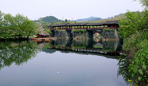 婺源還有不少廊橋,著名的當(dāng)數(shù)彩虹橋。它位于清華古鎮(zhèn)不遠(yuǎn),是一座規(guī)模宏大的廊橋,建于宋代,以木結(jié)構(gòu)為主,有多根木柱和木榫將整個(gè)廊橋連為一體。廊橋的兩旁有廊亭,廊亭的兩旁有長(zhǎng)凳可供行人休息,另有石桌石鼓凳,可用來(lái)品茶弈棋。游人站在橋上,只見(jiàn)兩岸青山如黛,橋下綠水長(zhǎng)流,一派優(yōu)美安寧的田園情調(diào)。
