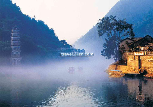 油的亮光,在鞋底和石板間產(chǎn)生著滑動(dòng)的力,腳趾便小心翼翼抓緊了鞋,如同與雨有了種游戲,心立即被挑動(dòng)得蠢蠢興奮了;业奶烊芙饬说跄_樓重重疊疊的輪廓,淡淡的泛開去的,只剩下窗欞里透出的柔的光。沱江緩緩地流動(dòng)著,擁著睡夢(mèng)中的古城,似乎呢喃著古老的夢(mèng)語,又似在不倦地哼著他母親般的搖籃歌謠。晨霧薄薄如紗,在遠(yuǎn)處山頭繚繞著,天不知何時(shí)開始亮了起來,灰色褪去了。一切的顏色開始還原,褐的墻、黑的瓦、紅的燈籠、綠的樹、墨綠的遠(yuǎn)山……