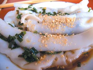 雞腸面與廣州的傳統(tǒng)拉腸粉相似,不過里面包裹的卻是豆芽、芹菜等料,相對于“保守”的云吞,它可算是“半開放”。