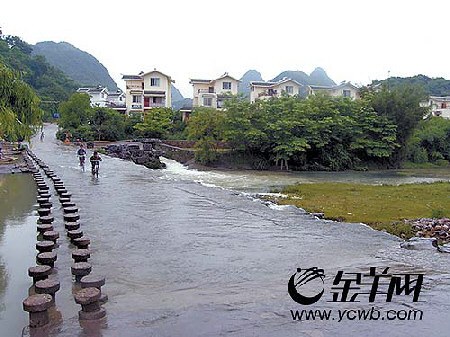 紅巖村最特別的地方是,無論車子還是行人,進(jìn)入紅巖村時都須經(jīng)過一條匠心獨具的水壩。水壩上有一列梅花樁模樣的水泥墩,專供行人行走;“梅花樁”旁,溪水嘩嘩向壩下流淌,車子從壩上涉水駛過,水很淺,但車輪子經(jīng)這么一沖洗,進(jìn)村后無不變得干凈爽利。