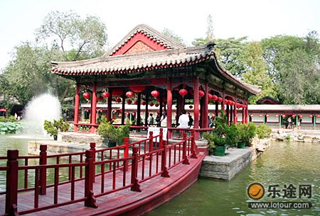 花園名為“朗潤園或萃錦園”,俗稱恭王府花園,徜徉于園中尤如漫步在山水之間。與府邸相呼應(yīng),花園也分為東中西三路。中路以一座西洋建筑風(fēng)格的漢白玉拱形石門為入口,以康熙皇帝御書“福”字碑為中心,前有獨樂峰、蝠池,后有綠天小隱、蝠廳,布局令人回味無窮。東路的大戲樓廳內(nèi)裝飾清新秀麗,纏枝藤蘿紫花盛開,使人恍如在藤蘿架下觀戲。戲樓南端的明道齋與曲徑通幽、垂青樾、吟香醉月、流杯亭等五景構(gòu)成園中之園;▓@內(nèi)古木參天,怪石林立,環(huán)山銜水,亭臺樓榭,廊回路轉(zhuǎn)。月色下的花園景致更是千變?nèi)f化,別有一番洞天。諸多中外游客慕名而至,尋覓著翠山碧水、曲徑幽臺在訴說的如煙往事。