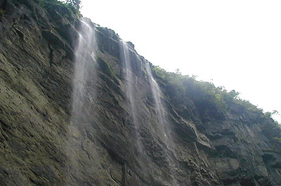 從巖壁小徑走去,水簾洞便赫然出現(xiàn)在眼前,它使橫穿瀑布的探險成為可能。雖然沒有花果山水簾洞的空闊奇妙,但在巖縫的空隙中穿行,讓鮮麗的水珠濺一身清爽,讓崎嶇曲折的登臨育一腔豪邁,足以令人心花怒放了。瀑底是深不可測的犀牛潭,從瀑底往下游走去,水流清澈得呈現(xiàn)出不可抗拒的誘惑。倘若此時不掬一掌的清水洗洗旅塵,那么留下的遺憾將可能是終生的。