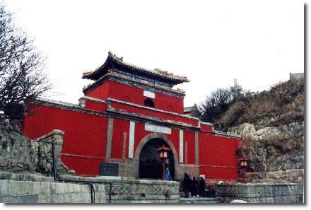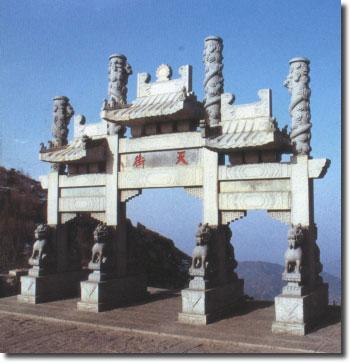 南天門---位于泰山十八盤的盡頭,海拔1460米,古稱“天門關(guān)”。它建在飛龍巖與翔鳳嶺之間的低坳處,雙峰夾峙,仿佛天門自開。元中統(tǒng)五年(1264年)布山道士張志純創(chuàng)建。門為閣樓式建筑,石砌拱形門洞,額題“南天門”。紅墻點(diǎn)綴,黃色琉璃瓦蓋頂,氣勢雄偉。門側(cè)有楹聯(lián)曰“門辟九霄仰步三天勝跡;階崇萬級俯臨千嶂奇觀”。