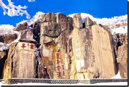 唐摩崖---在玉皇頂盤路東側(cè),大觀峰削崖為碑布滿了歷代題勒,其中最著名的是唐玄宗于開元十三年(725年)登封泰山時(shí)御制御書的《紀(jì)泰山銘》,俗稱“唐摩崖”。摩崖高13.3米,寬5.5米,全文1000字,書體為唐隸。文章典雅,書法遒勁,頗具盛唐風(fēng)格。