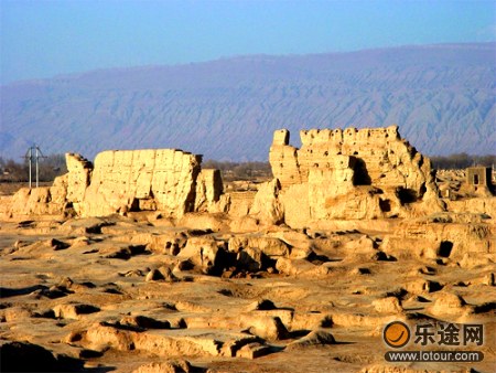 當(dāng)馬車在一個高臺前停下,我們一起下了車。在我們眼前有多座3米多高的土臺,還有高達(dá)15米的土坯方塔,導(dǎo)游說那是“可汗堡”,意為王宮。導(dǎo)游指著一座地上地下的雙層建筑說:那是宮殿的遺址。