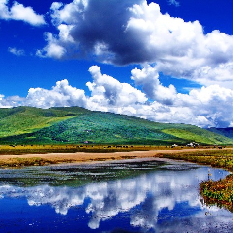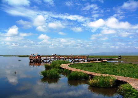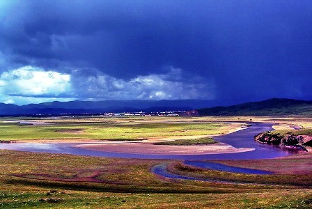 若爾蓋,宛如一塊鑲嵌在川西北部一顆瑰麗奪目的綠寶石,被國(guó)際地質(zhì)專家稱為“世界上面積最大、最原始、沒(méi)有受到人為破壞的最好的高原濕地” 。若爾蓋詔澤濕地一望無(wú)際、廣袤無(wú)垠,是中國(guó)最美的濕地大草原。若爾北部和東南部山地系秦嶺西部迭山余脈和岷山北部尾端,境內(nèi)雪山高聳,峽谷幽深,地勢(shì)陡峭。主要河流有嘎曲、墨曲和熱曲,從南往北匯入黃河。位于唐克鄉(xiāng)的九曲黃河第一灣,猶如仙女的飄帶自天邊緩緩飄來(lái),在廣闊的草原上蜿蜒迂回。當(dāng)晚霞滿天、夜霧降臨時(shí),九曲黃河就像從天而降的銀河,在夕陽(yáng)下閃爍著耀眼奪目的金光。此時(shí)登上唐克寺廟旁的山頂遠(yuǎn)眺,我們可以看見(jiàn)云在水中起,船在天上行的壯美景色。若爾蓋擁有川西北最大的濕地,這里的原野綠草如茵,野花五彩斑瀾,活蹦亂跳的牛羊,如散落在草原上的顆顆珍珠。此處還是國(guó)家一級(jí)保護(hù)野生動(dòng)物——黑頸鶴的主要繁殖棲息地,近千只黑頸鶴夏季在此繁殖后代。其遠(yuǎn)山寧?kù)o,原野空曠,草原上鷗翔鶴舞、水天一色。 境內(nèi)棲息著大量珍稀野生動(dòng)物,其中有白鸛、梅花鹿、小熊貓等。唐克河曲馬為全國(guó)三大名馬之一,被唐朝大詩(shī)人杜甫贊為:“竹披雙耳俊,風(fēng)如四蹄輕”。熱爾大草原一碧萬(wàn)頃,夢(mèng)幻花湖煙波浩渺,都是游人觀賞濕地的好去處。