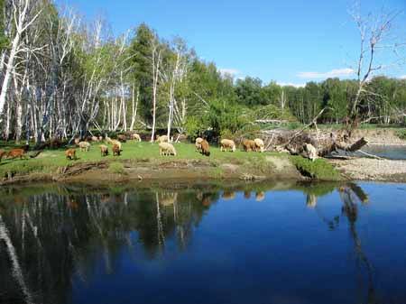 哈納斯河畔坐落著一個(gè)個(gè)小村落,那里的圖瓦人安靜、祥和地過(guò)著世外桃源般的生活。世世代代守在這片美景中,他們完整地保留了原始風(fēng)貌:生活習(xí)慣像哈薩克,語(yǔ)言是突厥語(yǔ),穿著打扮卻似蒙古人。村落中最美的是白哈巴村,金色、綠色,棕紅斑斕而成的天地間,園木搭建的小屋三三兩兩地散落著。木屋外面用細(xì)木材圍成柵欄,分割開人和牧群的生活區(qū)域。