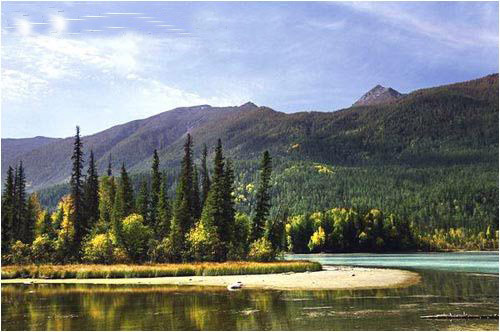 哈巴河位于新疆阿勒泰地區(qū)的西部,額爾齊斯河北岸,是孕育著童話故事的一個(gè)小縣城。阿勒泰在蒙古語(yǔ)中是金山的意思,此地森林茂密、雨雪充沛,是邊疆荒漠中的綠色天堂。巨大的冰川和融雪蜿蜒成最美的河流哈納斯,在金光閃爍、連綿起伏的阿勒泰腳下靜靜地流淌。整個(gè)阿勒泰山區(qū)垂直分布著從溫帶落葉林到極地苔蘚各種植物,生活在這里的牧民可以從每一種景觀的色調(diào)變化中看到時(shí)間,從而確定轉(zhuǎn)場(chǎng)游牧的時(shí)間。哈納斯河最美的河段叫月亮灣。從山顛往下看,形如彎月的河灣將兩岸金色的白樺林分割成許多片斷。絕妙之處在于水色,晴天深綠,陰天灰白。