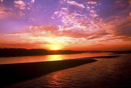 伊犁河上游有三大支流:特克斯河、鞏乃斯河和喀什河。特克斯河是主源,發(fā)源于汗騰格里峰北側(cè)。伊犁河向西流至伊寧途中有喀什河流入,以下進(jìn)入寬大的河谷平原,河床開闊,支流眾多,渠系縱橫。在接納右岸的霍爾果斯等河后進(jìn)入哈薩克斯坦,最后注入巴爾喀什湖。在我國境內(nèi)全長約400多公里。