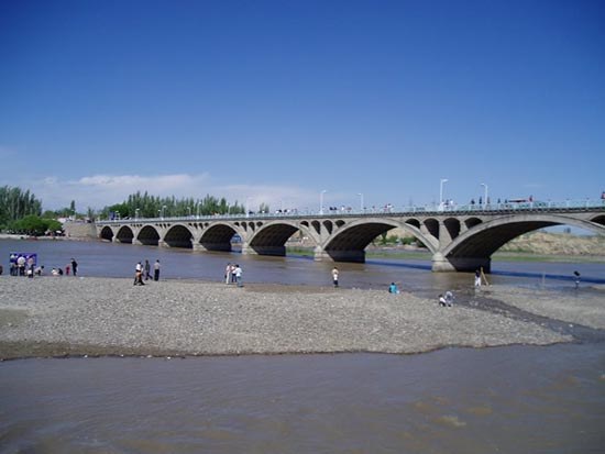 1959年,伊寧市城南處河道修建了一座大僑, 1975 年重建,橋型是鋼筋混凝土雙曲拱橋,沿河開辟了千余畝河濱公園,成為人們旅游度假的佳勝景點(diǎn)。