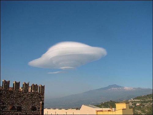 這是攝影師在山區(qū)拍攝到的云朵景觀,晴朗的天空中出現(xiàn)了類似于不明飛行物(UFO)的云朵,遠(yuǎn)處看這個(gè)巨大的“UFO”云朵好像正在旋轉(zhuǎn)著向地面降落。