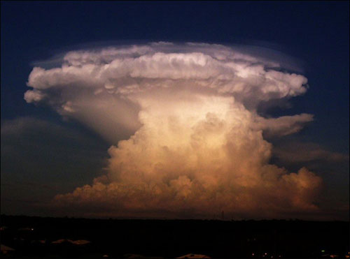 這個(gè)傍晚拍攝的云朵照片似乎很容易讓人聯(lián)想起核爆炸形成的“蘑菇云”景觀。不過請(qǐng)不用擔(dān)心,這個(gè)云朵里有的只是水蒸氣和空氣塵埃,并沒有“蘑菇云”里散發(fā)出的放射性物質(zhì)。