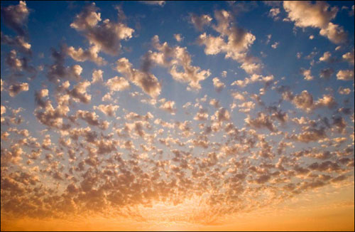 寧靜的黃昏時(shí)期,太陽把部分天空照成了桔黃色,高空中風(fēng)已經(jīng)把云層吹散開。從地面觀看,天空中的云朵像飄散的棉絮。