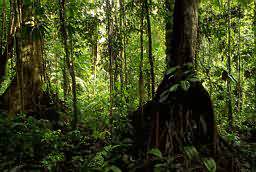 熱帶雨林中植物種類繁多,其中喬森具有多層結(jié)構(gòu);上層喬木高過30米,多為典型的熱帶常綠樹和落葉闊葉樹,樹皮色淺,薄而光滑,樹基常有板狀根,老干上可長出花枝。木質(zhì)大藤本和附生植物特別發(fā)達,葉面附生某些苔蘚、地衣,林下有木本蕨類和大葉草本。雨林中的樹林多為雙子葉植物,具有厚的革質(zhì)葉和較淺的根系。用以營養(yǎng)的根部通常只有幾厘米深。雨林中的雨水因葉面的蒸發(fā)而丟失很多。熱帶雨林中土壤和巖石的風化作用強烈,其風化殼可達100米。這類土壤雖富含鋁、鐵氧化物、氫氧化物和高嶺石,但其他一些礦物質(zhì)卻因淋溶和侵蝕作用而流失。另外,在高溫高濕條件下,有機物分解很快,能迅速被饑餓的樹根和真菌所吸收。所以,這里的土壤其實并不肥沃。