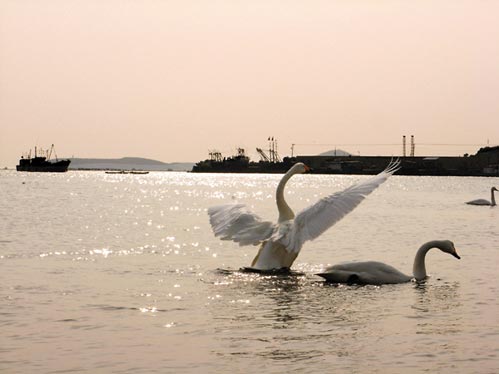 天鵝們的生活簡單而快樂,在白白的鵝群中間或也能看到灰色羽毛的天鵝,據(jù)說這些都是年輕的小鵝,雖然體形已經(jīng)和成年鵝差不多了,但是還沒有完全成熟,它們同樣也經(jīng)歷了長距離的飛行才來到這里,等它們飛回老家時(shí),或許會(huì)變成真正成熟的大天鵝。天鵝們也有小小的爭斗,有的天鵝專門去啄闖入自己“領(lǐng)海”的“不速之客”的屁股,而那些“不速之客”也知趣地逃開,很少出現(xiàn)互毆或者群毆的狀況,那些“霸道”家伙們的舉動(dòng),著實(shí)令人啞然失笑。