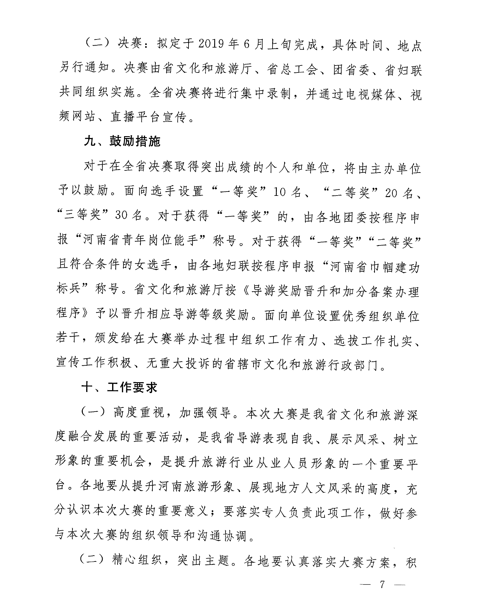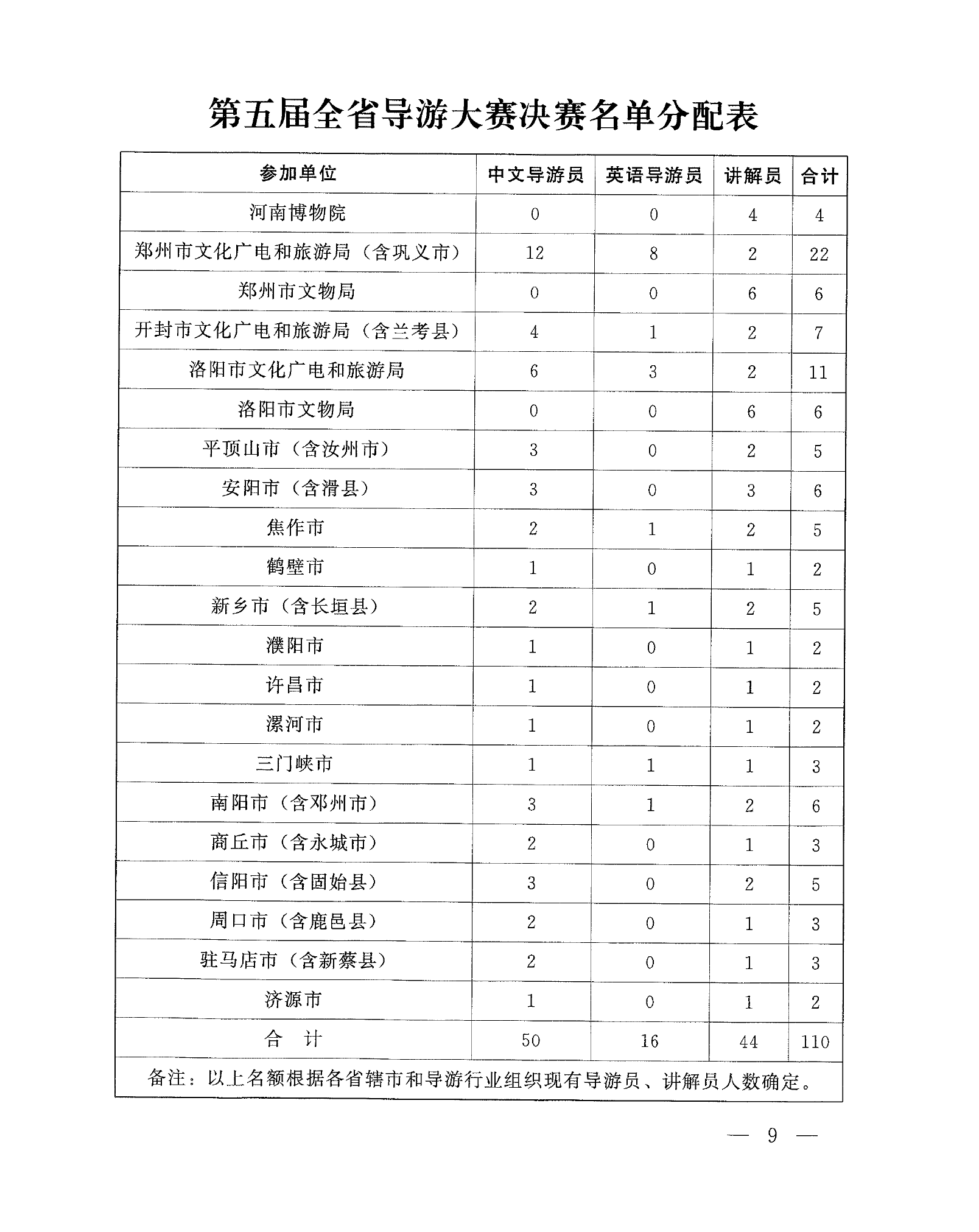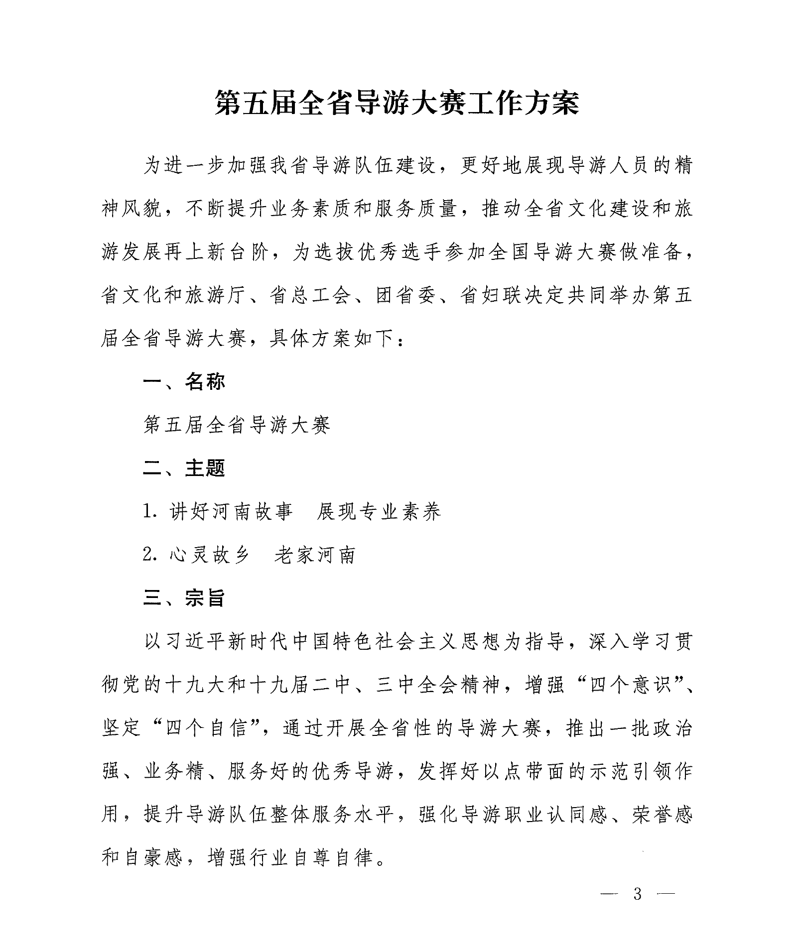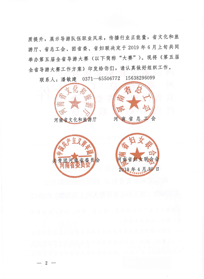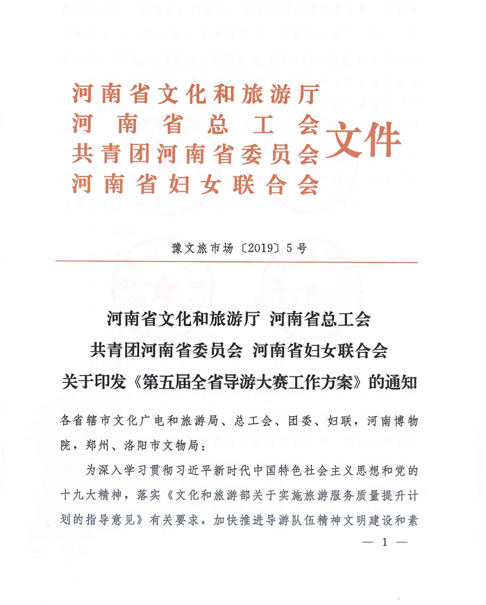 河南省文化和旅游廳 河南省總工會 共青團(tuán)河南省委員會 河南省婦女聯(lián)合會 關(guān)于印發(fā)《第五屆全省導(dǎo)游大賽工作方案》的通知