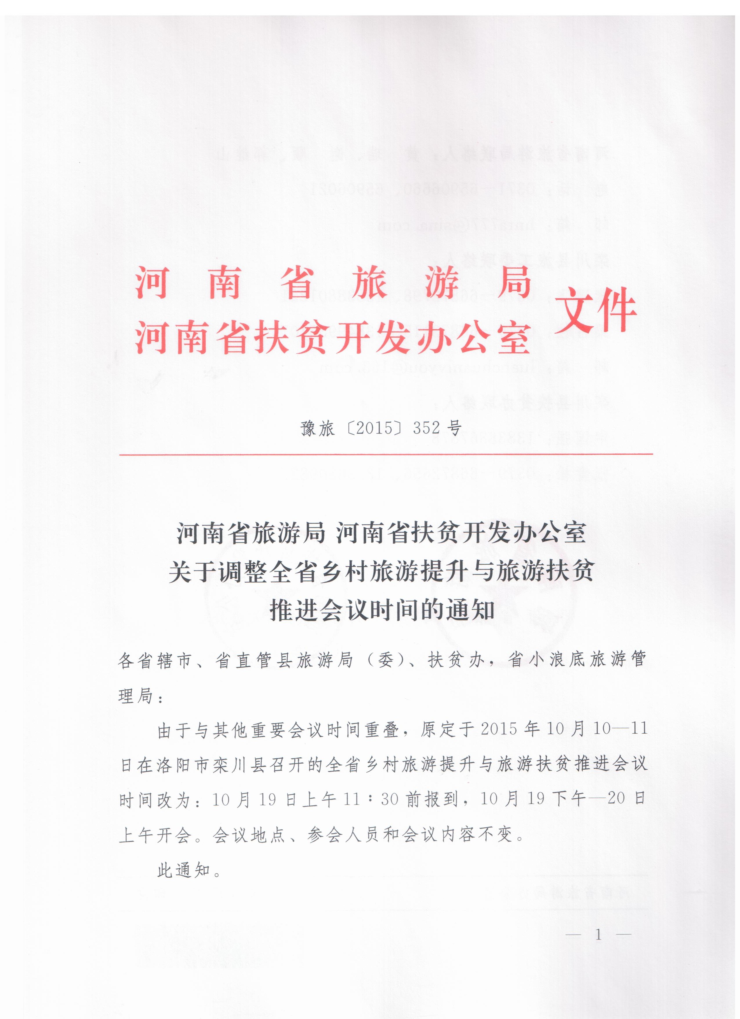河南省旅游局 河南省扶貧開發(fā)辦公室關(guān)于調(diào)整全省鄉(xiāng)村旅游提升與旅游扶貧推進(jìn)會(huì)議時(shí)間的通知