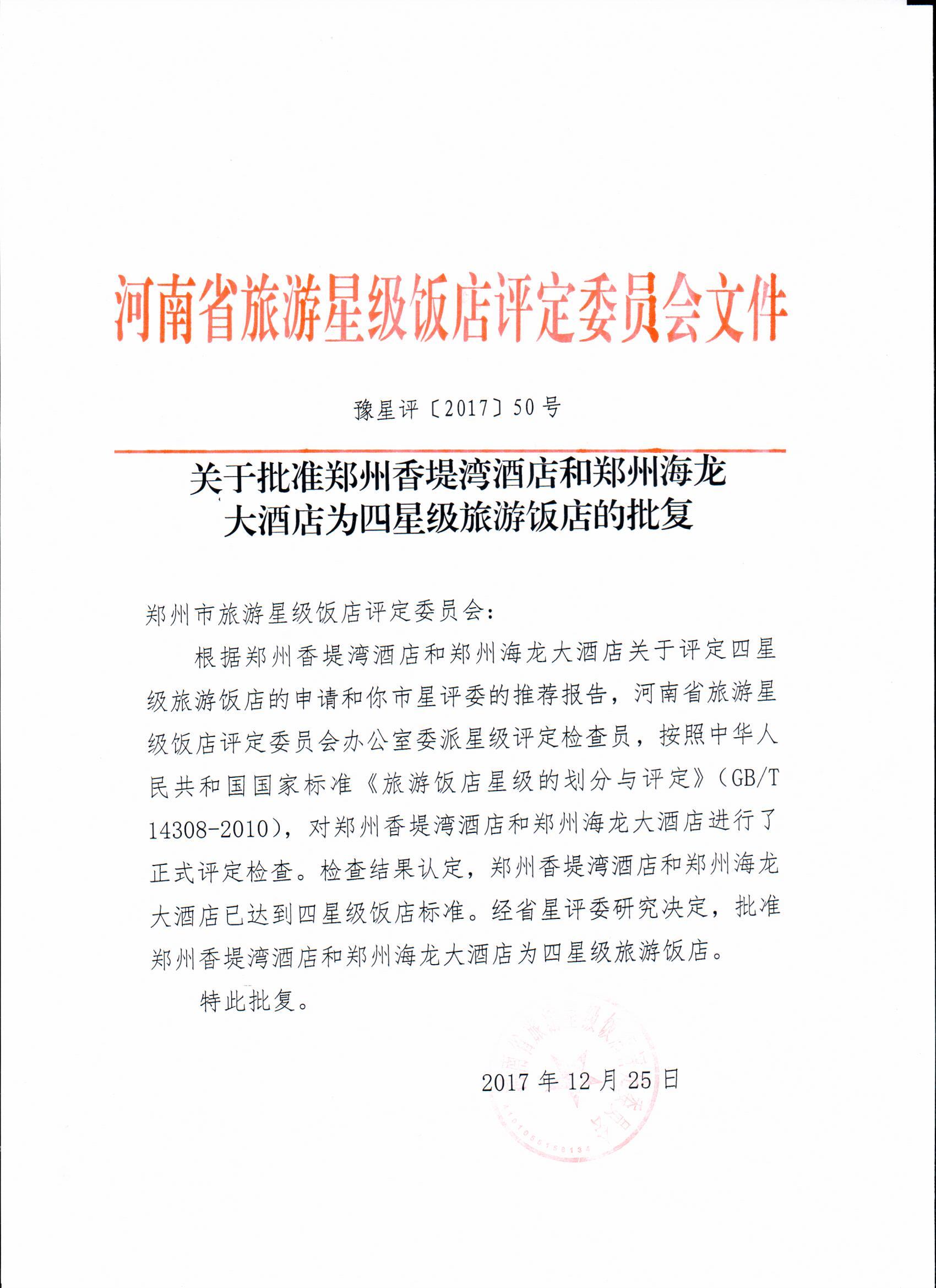 關(guān)于批準(zhǔn)鄭州香堤灣酒店和鄭州海龍大酒店為四星級旅游飯店的批復(fù)
