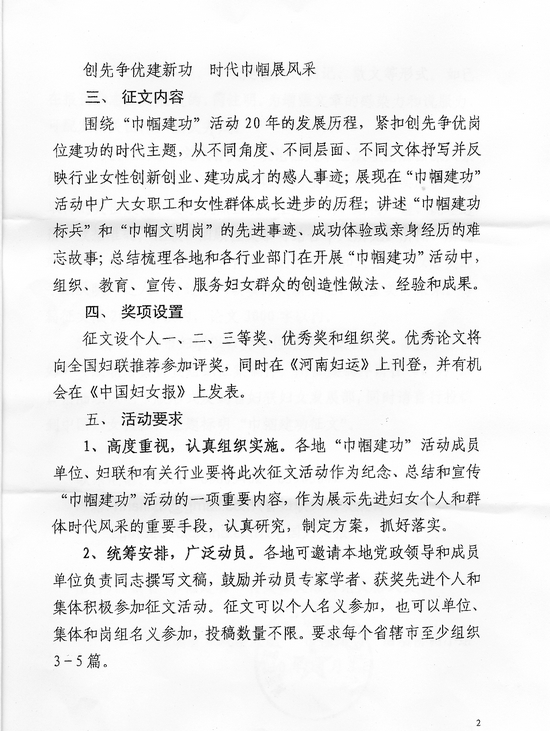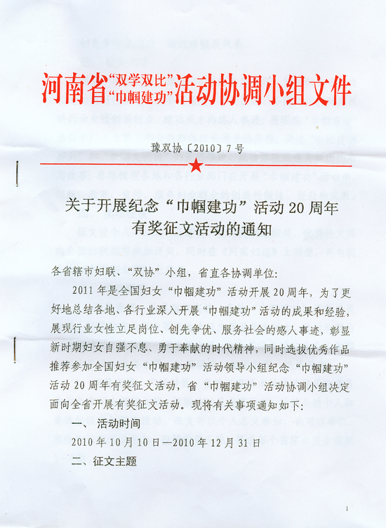 關(guān)于開展紀(jì)念“巾幗建功”活動20周年有獎?wù)魑幕顒拥耐ㄖ?/div>