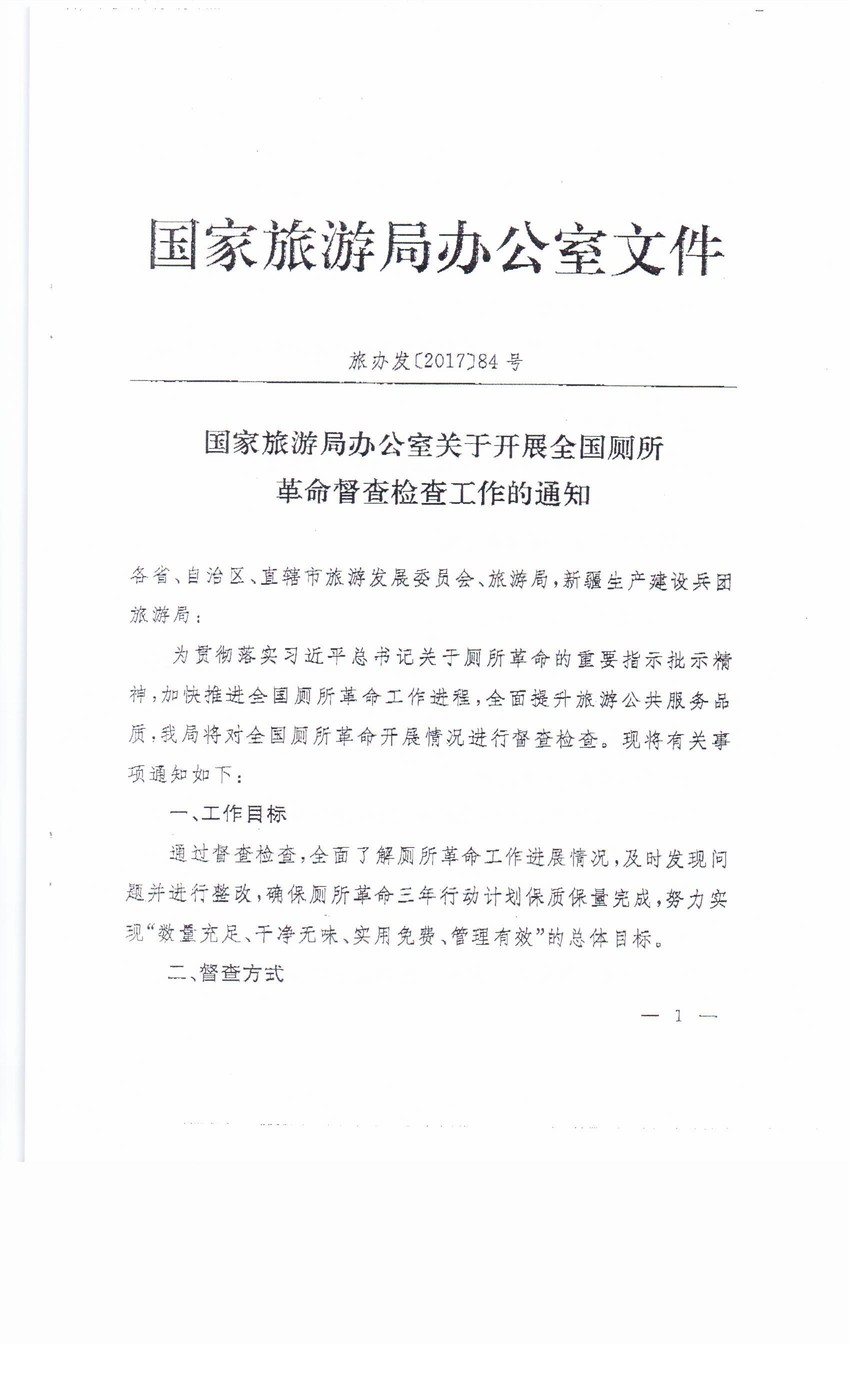 附件:《國家旅游局辦公室〈關(guān)于開展全國廁所革命督查檢查工作的通知》(旅辦發(fā)〔2017〕84號)