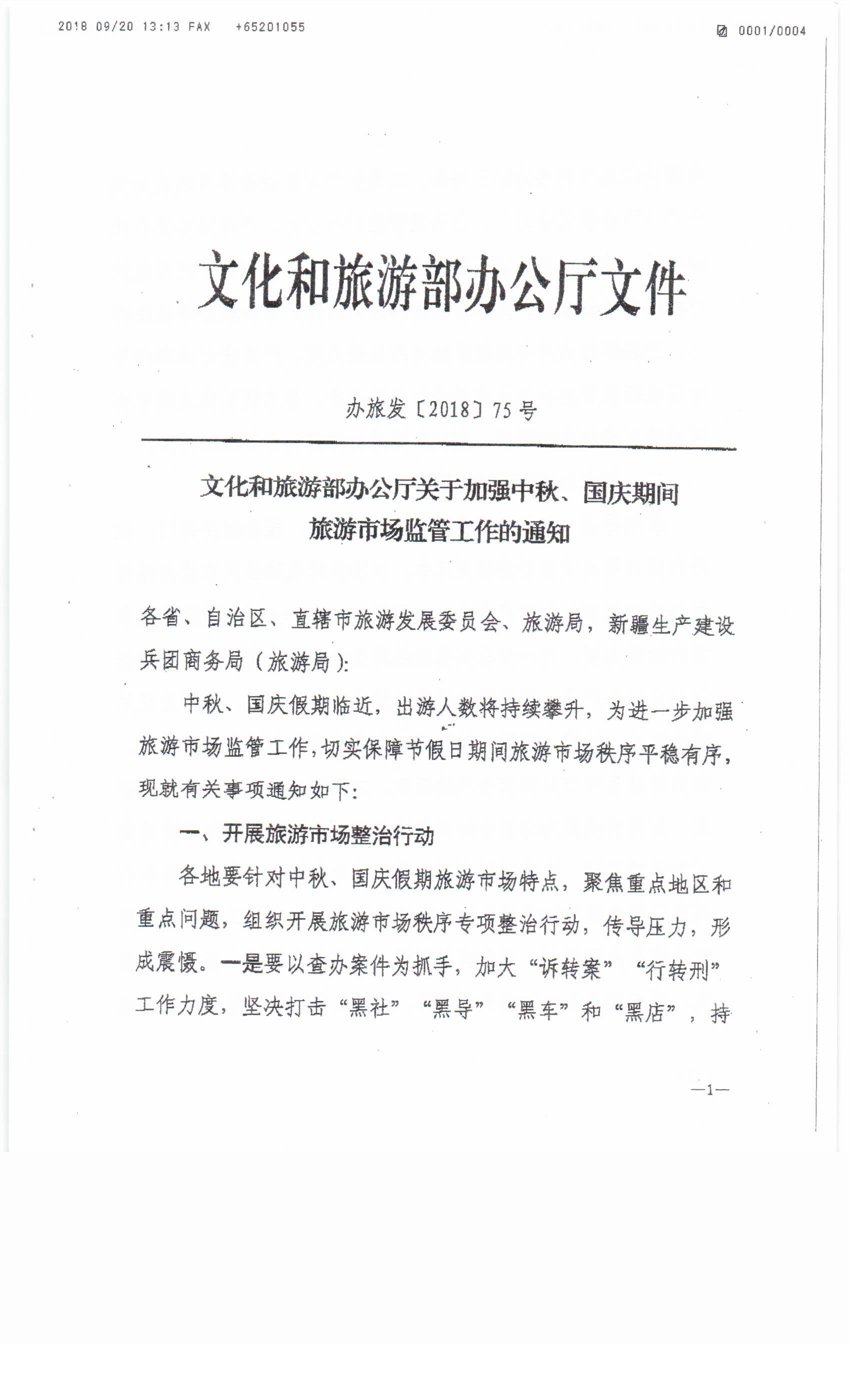 附件:文化和旅游部辦公廳《關(guān)于加強(qiáng)中秋、國慶期間旅游市場監(jiān)管工作的通知》(辦旅發(fā)[2018]75號(hào))
