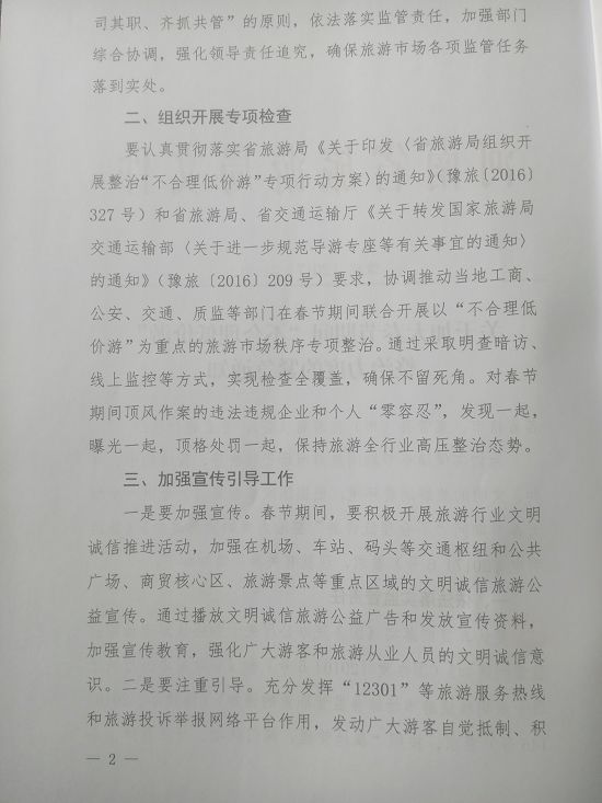 要認(rèn)真貫徹落實(shí)省旅游局《關(guān)于印發(fā)<省旅游局組織開(kāi)展整治“不合理低價(jià)游”專(zhuān)項(xiàng)行動(dòng)方案>的通知》(豫旅[2016]327號(hào))和省旅游局、省交通運(yùn)輸廳《關(guān)于轉(zhuǎn)發(fā)國(guó)家旅游局交通運(yùn)輸部<關(guān)于進(jìn)一步規(guī)范導(dǎo)游專(zhuān)座等有關(guān)事宜的通知>的通知》(豫旅[2016]209號(hào))要求,協(xié)調(diào)推動(dòng)當(dāng)?shù)毓ど獭⒐、交通、質(zhì)監(jiān)等部門(mén)在春節(jié)期間聯(lián)合開(kāi)展以“不合理低價(jià)游”為重點(diǎn)的旅游市場(chǎng)秩序?qū)m?xiàng)整治。通過(guò)采取明查暗訪(fǎng)、線(xiàn)上監(jiān)控等方式,實(shí)現(xiàn)檢查全覆蓋,確保不留死角。對(duì)春節(jié)期間頂風(fēng)作案的違法違規(guī)企業(yè)和個(gè)人“零容忍”,發(fā)現(xiàn)一起,曝光一起,頂格處罰一起,保持旅游全行業(yè)高壓整治態(tài)勢(shì)。