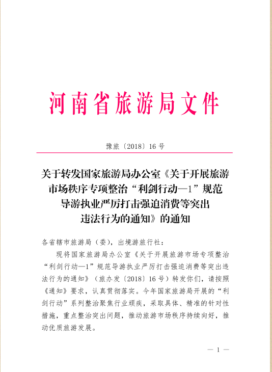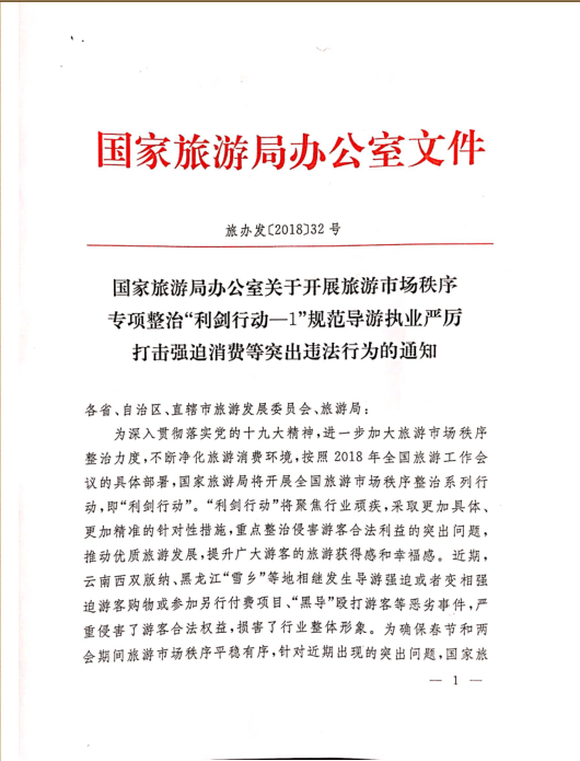 關(guān)于轉(zhuǎn)發(fā)國(guó)家旅游局辦公室《關(guān)于開展旅游市場(chǎng)秩序?qū)m?xiàng)整治“利劍行動(dòng)—1”規(guī)范導(dǎo)游執(zhí)業(yè)嚴(yán)厲打擊強(qiáng)迫消費(fèi)等突出違法行為的通知》的通知
