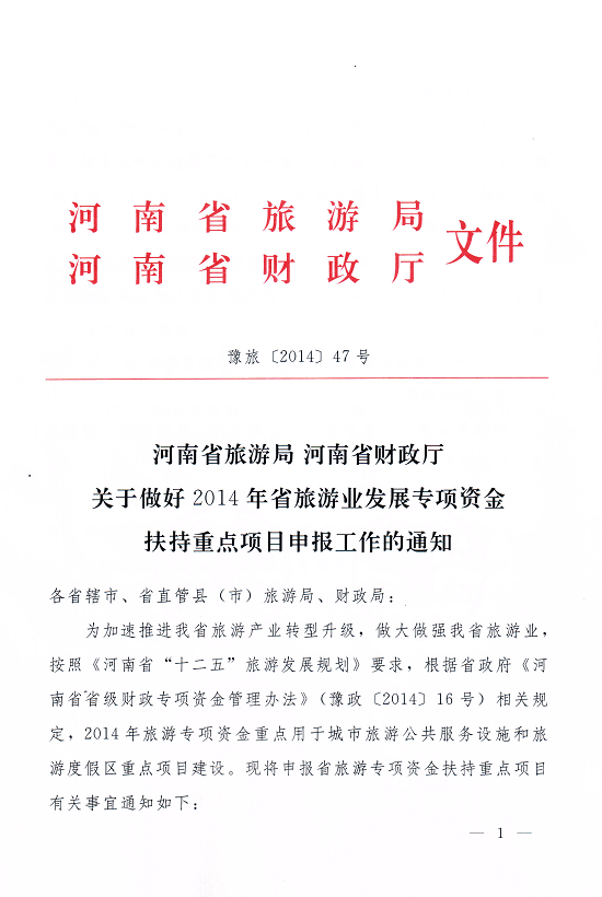 為加速推進我省旅游產(chǎn)業(yè)轉(zhuǎn)型升級,做大做強我省旅游業(yè),按照《河南省“十二五”旅游發(fā)展規(guī)劃》要求,根據(jù)省政府《河南省省級財政專項資金管理辦法》[豫政(2014)16號]相關(guān)規(guī)定,2014年旅游專項資金重點用于城市旅游公共服務(wù)設(shè)施和旅游度假區(qū)重點項目建設(shè),F(xiàn)將申報省旅游專項資金扶持重點項目有關(guān)事宜通知如下: