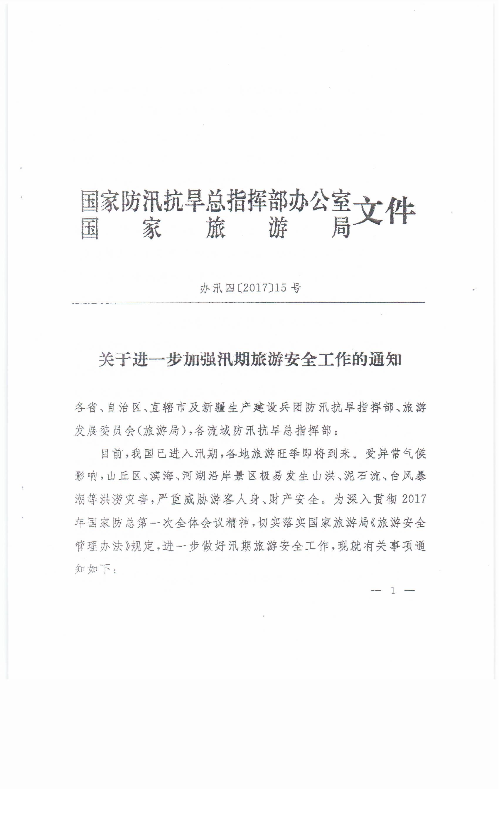 現(xiàn)將國家防汛部、國家旅游局聯(lián)合下發(fā)的《關(guān)于進(jìn)一步加強(qiáng)汛期旅游安全工作的通知》<辦訊四(2017)15號>轉(zhuǎn)發(fā)你們,請結(jié)合自身實(shí)際,抓好貫徹落實(shí)。