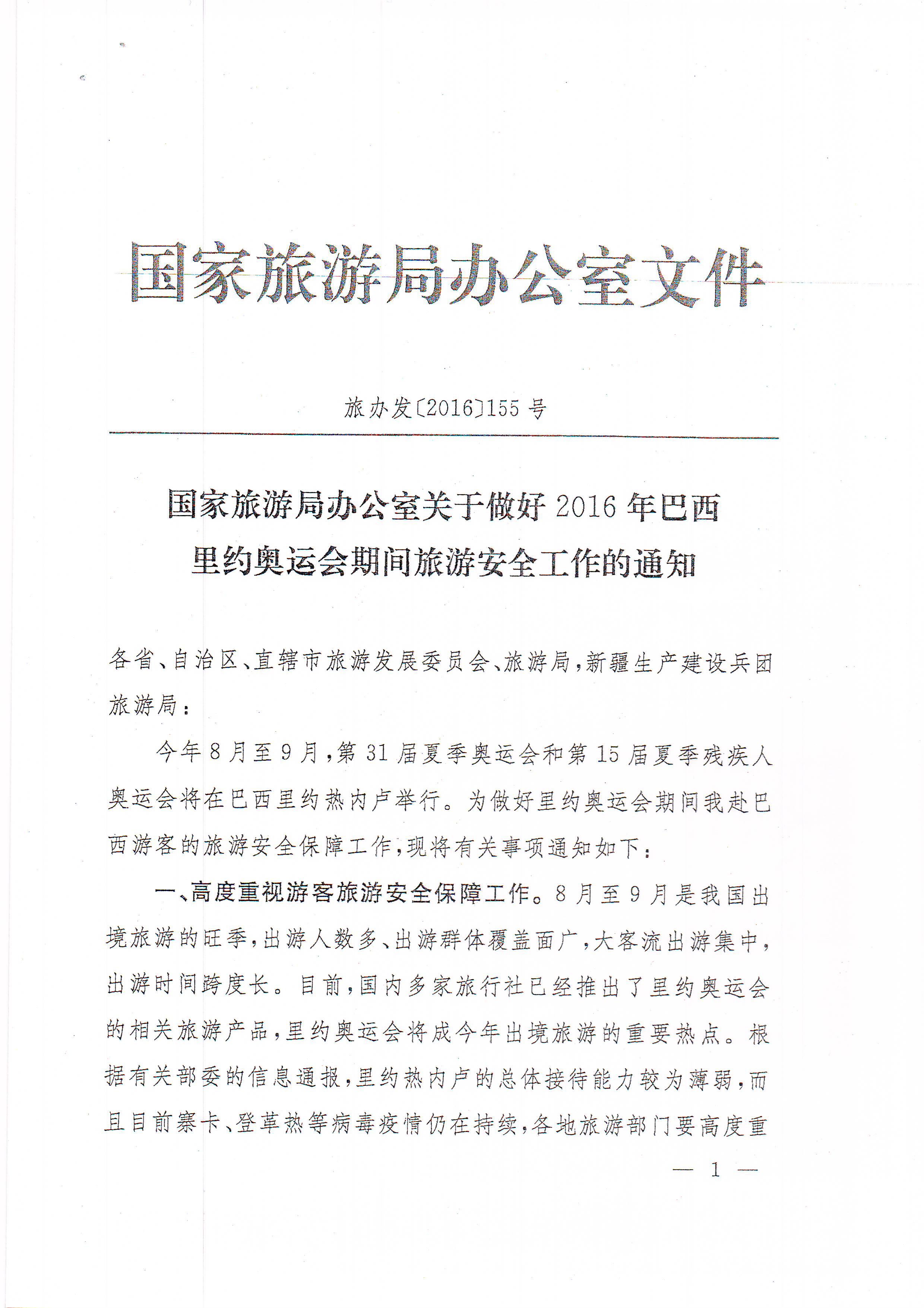 附件:國家旅游局辦公室《關(guān)于做好2016年巴西里約奧運(yùn)會(huì)期間旅游安全工作的通知》(旅辦發(fā)〔2016〕155號(hào))