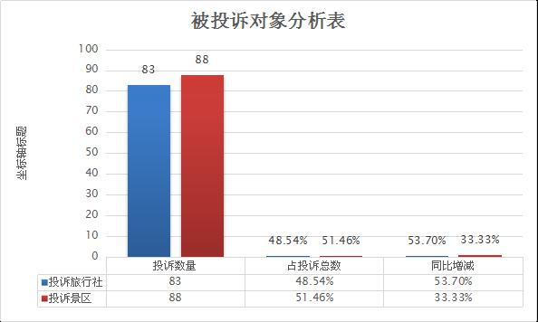 從立案總量看,第三季度受理投訴171件,較去年比減少19件(同比減少10%)。從投訴對象看,投訴旅行社83件,占投訴總量的48.54%,同比增加53.7%;投訴景區(qū)88件,占投訴總量的51.46%,同比減少33.33%。