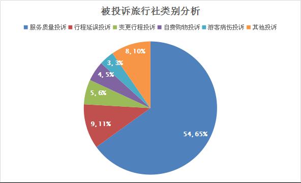 第三季度投訴旅行社數(shù)量明顯增加,投訴旅行社83件,同比增加53.7%,其中出境游投訴總數(shù)為22件,國內(nèi)游61件。服務(wù)質(zhì)量投訴54件,行程延誤投訴9件,變更行程投訴5件,自費購物投訴4件,游客病傷投訴3件,其他投訴8件。
