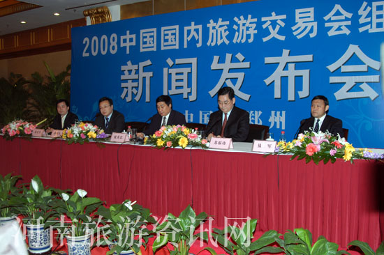 2008中國國內(nèi)旅游交易會暨世界旅游城市市長論壇將于明天盛大開幕。為向旅游業(yè)界、新聞媒體詳細(xì)介紹2008中國國內(nèi)旅游交易會的具體情況,2008中國國內(nèi)旅游交易會組委會于4月9日在鄭州舉行新聞發(fā)布會。2008中國國內(nèi)旅游交易會組委會秘書長、國家旅游局旅游促進(jìn)與國際聯(lián)絡(luò)司司長祝善忠,2008中國國內(nèi)旅游交易會組委會副秘書長、河南省旅游局局長蘇福功,2008中國國內(nèi)旅游交易會組委會副秘書長、國家旅游局旅游促進(jìn)與國際聯(lián)絡(luò)司副司長薛亞平,2008中國國內(nèi)旅游交易會組委會副秘書長、鄭州市委常委、副市長趙瑞東,大連市旅游局局長易軍以及中央媒體、河南省直、省會媒體記者參加了新聞發(fā)布會。