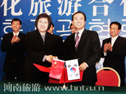 下午,雙方旅游業(yè)界舉行了“豫韓文化旅游合作懇談會(huì)”。河南省旅游局副局長(zhǎng)何琳和韓國(guó)摸德旅行社常務(wù)孫浩權(quán)簽訂了《鄭州——仁川旅游包機(jī)合作協(xié)議》。