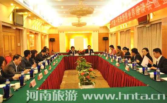 4月11日,廣東•河南旅游業(yè)界座談會暨簽約儀式在河南省會鄭州召開,河南省旅游局副局長何琳,廣東省旅游局副巡視員林上福出席座談會。廣東省旅游局調(diào)研員吳曉麗主持座談會。豫粵兩地的旅行社代表參加了座談會。