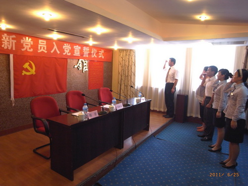 在黨的90歲生日到來之際,6月25日新鄉(xiāng)賓館在敏學廳召開全體黨員、積極分子、管理人員會議,舉行新黨員入黨宣誓儀式,慶祝黨的生日。