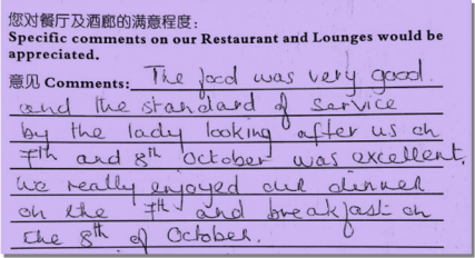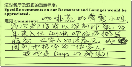 簡短的致謝信表達(dá)出賓客對酒店服務(wù)的認(rèn)可,也反映出酒店良好的賓客關(guān)系,以及賓客對焦作和中國的美好印象。