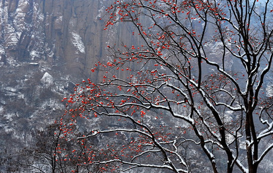 最妙的當屬下點小雪了,看冬天的精靈輕歌曼舞,飄飄灑灑落在漫山遍野,放眼望去,整個山體銀裝素裹,猶如進入了一個精靈的世界,偶爾露出的點點翠綠,為沉寂的大山帶去了一抹俏皮。一場雪剛過,整個山體猶如穿上了一件水晶衣,在陽光下閃閃發(fā)亮。壁立千仞的百丈紅巖上,散落著或多或少的皚皚白雪,鄉(xiāng)民未來得及摘取的柿子還猶如一盞盞燈籠掛在樹頭,一層層白雪蓋在上面,煞是好看。在1500米的海拔上,更能見到霧凇、冰掛、冰瀑,這些都是平時難得一見的奇觀,蔚為壯觀。