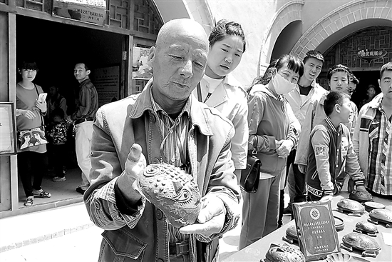 省級非遺項(xiàng)目黃河澄泥硯傳承人王池在向游客介紹澄泥硯的制作過程