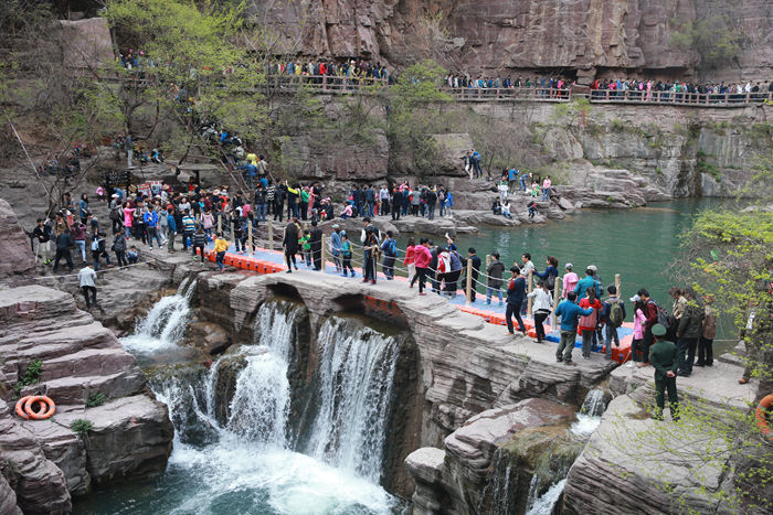 近年來(lái),云臺(tái)山景區(qū)假日旅游市場(chǎng)火暴,連續(xù)三年清明期間的游客接待量居河南省第一,受到了社會(huì)與媒體的廣泛關(guān)注。清明假期第二天,中央電視臺(tái)記者走進(jìn)云臺(tái)山,連線直播云臺(tái)山清明假日旅游盛況。記者隨游客進(jìn)入云臺(tái)山最熱門的景點(diǎn)紅石峽,真實(shí)地感受和體驗(yàn)了云臺(tái)之游的“熱度”。記者看到,景區(qū)在紅石峽入口處設(shè)置了回形緩沖帶,在崖壁道路段安排工作人員維持秩序,保證游客安全。盡管由于地勢(shì)地貌的特殊性,在紅石峽入口處的黑龍洞口游客通行緩慢,但出了黑龍洞,紅石峽丹崖碧水、飛瀑流泉的景色還是游客眼前豁然開(kāi)朗,心情陡然舒暢,游客也紛紛表示“水好、景好”,“看著美景,心情也好了!”