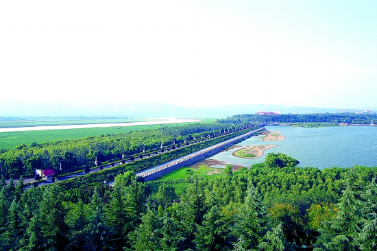 為了給游客提供便捷的服務,營造舒適、休閑的環(huán)境,自2008年以來,濕地公園累計完成建設項目投資1.5億元,加大征地、旅游基礎設施、服務設施、景觀設施、文化提升五類工程建設;完善了公園路網(wǎng)建設,新建了給水、供電亮化工程,安裝了音響和監(jiān)控工程等基礎設施;完成了景區(qū)覆蓋式綠化、牡丹苑精品綠化、濕地地形整理及水生植物種植等綠化工程;完成了游客接待中心、服務中心、觀鳥屋、垃圾箱座凳等一批服務設施工程建設;完成了迎祥閣、水天閣、霞鶩亭、共影廊等一批景觀設施工程;完成了新建景觀設施工程的楹聯(lián)書寫、匾額制作安裝、黃河岸邊文化墻詩書寫、迎祥閣文化布展、生態(tài)教育基地建設、環(huán)湖木棧道科普長廊建設、景區(qū)景石安置等部分文化提升工程……濕地公園的自然環(huán)境得到了良好保護,文化內(nèi)涵也得到進一步挖掘。