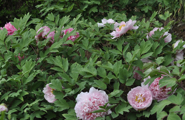 今天,雨過(guò)天晴,雞冠洞景區(qū)的高山牡丹園里的香玉、肉芙蓉、二喬、趙粉、姚黃、洛陽(yáng)紅等10余種早開(kāi)品種悄露芳容。