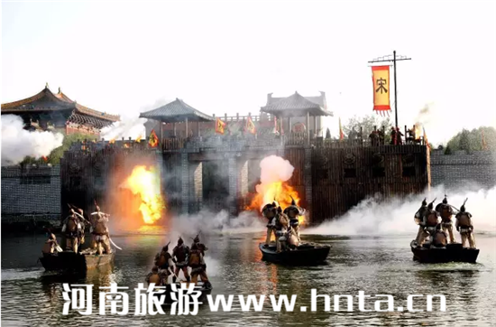 《岳飛槍挑小梁王》帶給清園人的欣喜,并沒有讓他們因陶醉而停止創(chuàng)新的腳步。2014年9月,又一個經(jīng)過精心準(zhǔn)備的大型水戰(zhàn)劇目《大宋·東京保衛(wèi)戰(zhàn)》與觀眾見面。劇目中,古代兵器的展示、震耳土炮的轟鳴、戰(zhàn)火紛飛的場面,讓觀眾贊不絕口,流連忘返。這場水戰(zhàn)劇目和《岳飛槍挑小梁王》《包公巡視汴河漕運》《梁山好漢劫囚車》《大宋·東京夢華》等大型優(yōu)秀劇目互為補充,形成了中原首個實景演藝集群,為清明上河園打造國家精品景區(qū)奠定了良好基礎(chǔ),更為持續(xù)提升、強化科技對旅游的引領(lǐng)找到了更加有力可靠的支撐。